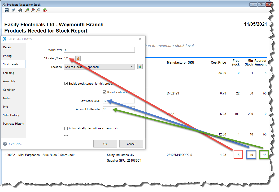 - Finally you can set how many items you wish to Re-order (green arrow). For instance you might receive price breaks from your suppliers if you order a certain amount.