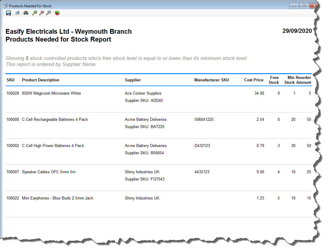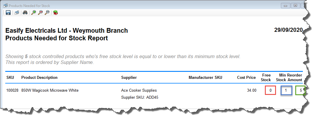 At the top of the report you will see a summary of how the report is compiled: The report will list any products on which the free stock level is equal or lower to the minimum stock level for that product.