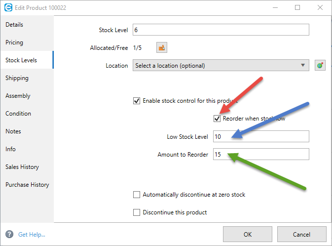 - First you will need to tick the 'Reorder When Stock Low' box (red arrow).