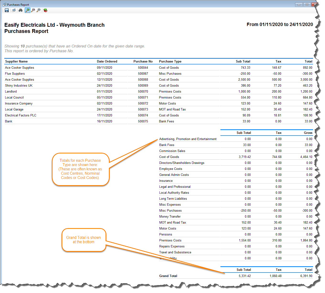 The Purchases Report shows all the Purchases and Expenses you have placed over any given period.