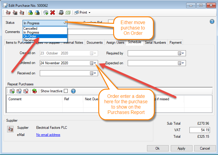 For instance you might raise a purchase and order some goods, so you mark the purchase as on order. At this point it will show on the Purchases Report.
