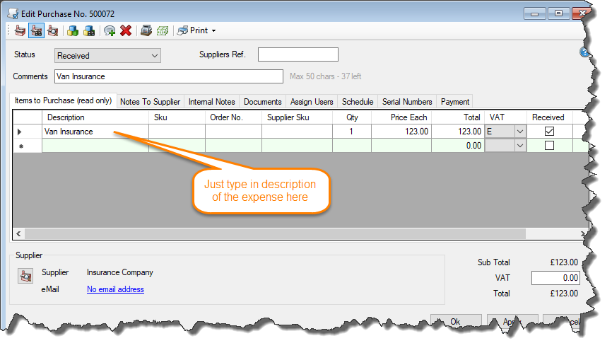 Later when you receive the invoice from your supplier, you mark the purchase as invoiced and enter an invoice date. If you are using Standard VAT Accounting the purchase will then show on your VAT return. However if you are using Cash VAT Accounting the purchase won't show on your VAT return until you pay for the purchase.