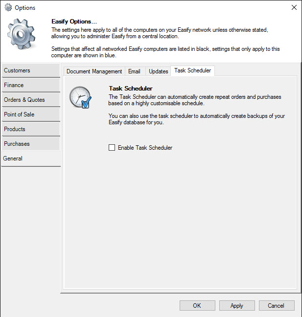 Tick the Enable Task Scheduler box and you are ready to start scheduling Orders, Purchases and Backups.