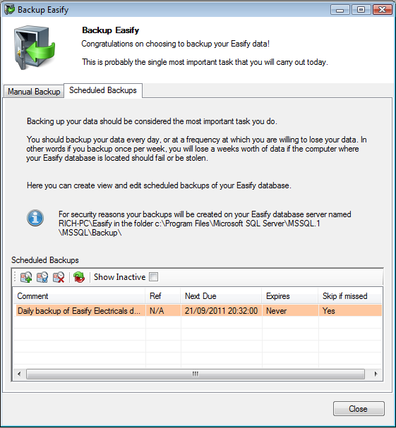 The backups will be saved to the hard disk on your Easify Server, and should be periodically copied to removable media and stored securely off-site.