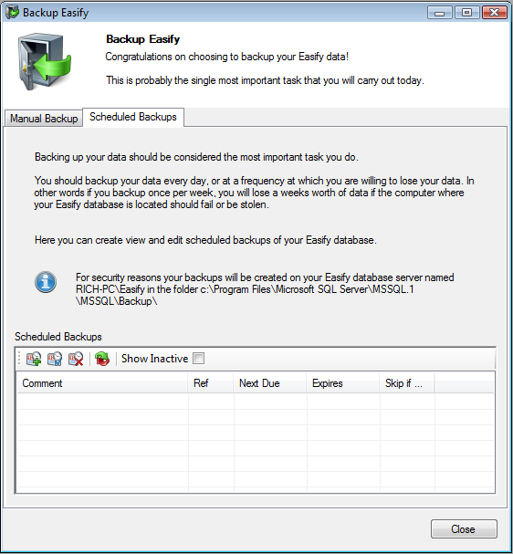 You can configure Easify to automatically save backups of your Easify database to disk on a schedule of your choosing.