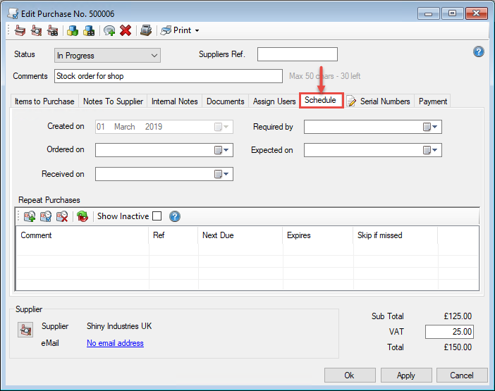 Select the Schedule tab in the purchase details window, and you will any schedules that have been created for the purchase.