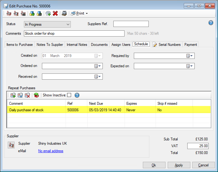 The task will now run as scheduled and when it does a copy of the purchase will be created.