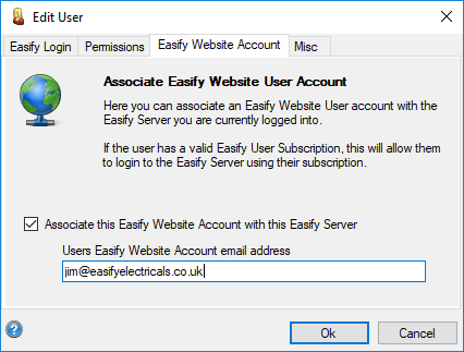 To associate a user, tick the Associate this Easify Website Account with this Easify Server checkbox, and enter their email address where it says Users Easify Website Account email address.