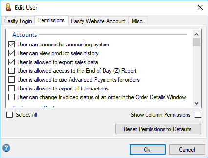 Here you will see a list of all available Easify permissions showing which permissions the selected user has been granted. Click here for a full list of Easify Permissions and their meanings.