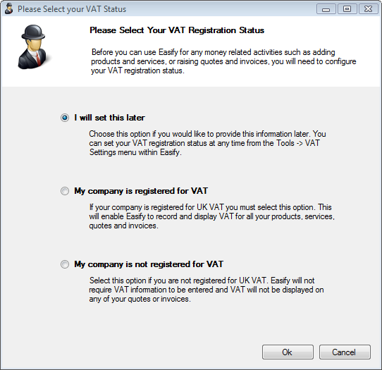 If you choose "I will set this later" you can close the window, but it will re-appear anytime you attempt to launch any Easify Pro feature that relates to money. Which in actual fact is most of Easify, so this option is only really used to dismiss the window while you decide what your VAT status is.