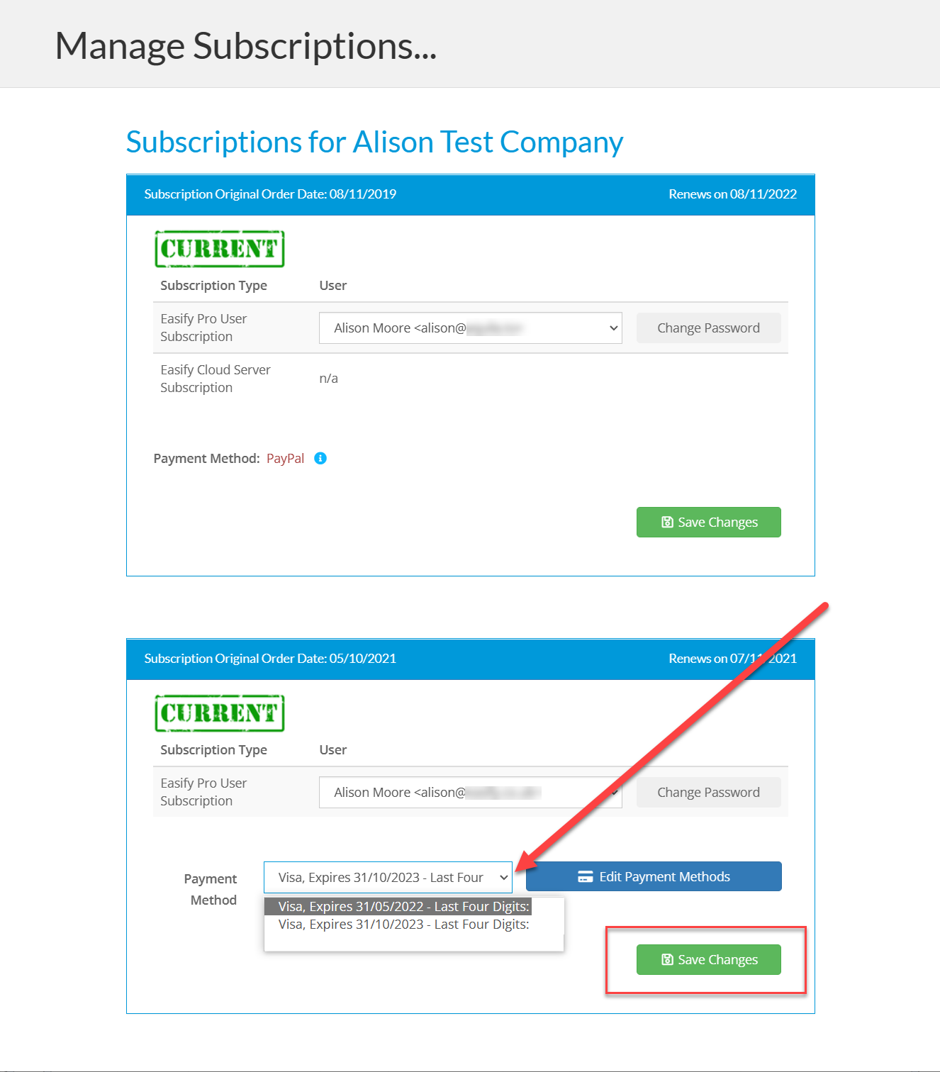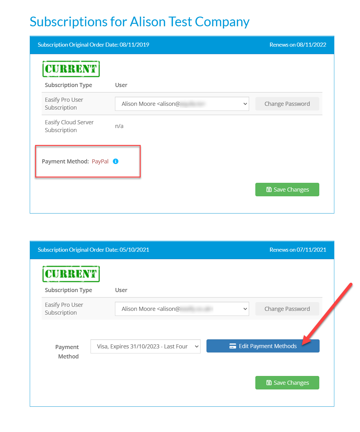 However the second subscription has a Visa card as its payment method with an Edit Payment Methods button next to it. This shows that this subscription was set up on our current payment system and you can add a new card or change the payment method as required.