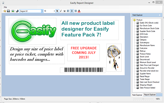 The label designer allows you to print barcodes, images and text onto anything such as product price labels, warranty void stickers, shelf edge labels, flyers, price tickets etc...