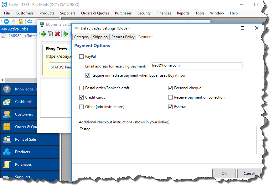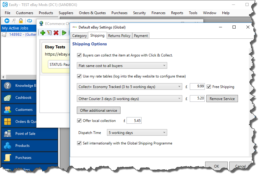 This means that you could setup your shipping options globally on the eBay channel connector, you could configure the categories that the products will sell in on each Easify category, and for each individual product you could override the shipping method, or indeed any other eBay setting that you wanted to.