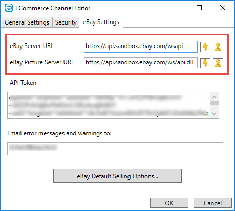 First go to the ECommerce Channel Manager and view the eBay channel settings. On the eBay Settings tab make sure the eBay Server URL and eBay Picture Server URL are set to the correct values, e.g. if you are using a sandbox API Token make sure the sandbox URL is being used (click the yellow crash test dummy button to the right of the eBay Server URL Textbox). Or if you are using a live API Token make sure you are using the live eBay server URL (click the yellow lightning flash button to the right of the eBay Server URL Textbox).