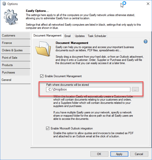If you have a lot of Easify Users on a local network, and don't want to install Dropbox on all of their computers, we have an advanced guide here - Using the Document Management System (DMS) with DropBox via Network Share (Advanced Setup) that describes a more advanced setup where you have Dropbox running on one server computer, and the Easify Pro Clients access the folder via a network share.