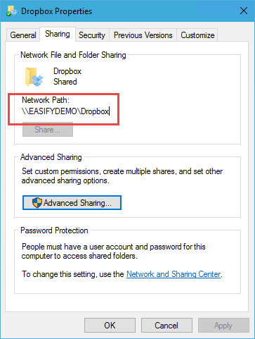 The drive letter should be mapped to the network share path that you determined above e.g. \\EASIFYDEMO\DropBox