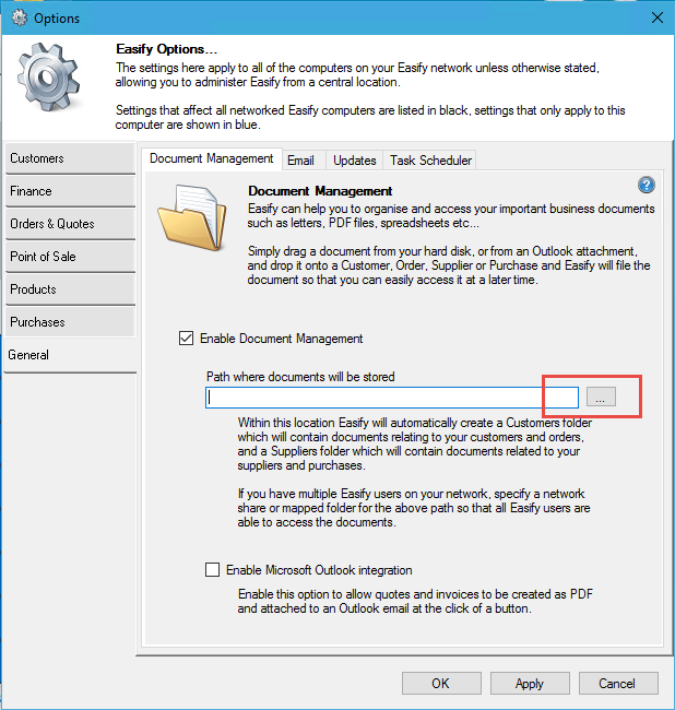 Before you start getting everything setup, remember that the Easify DMS simply stores files in a folder on a Windows based PC or laptop. You configure where this folder is in Easify Options.