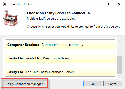 You can launch the Easify Connection Manager by clicking the Easify Connection Manager button in the Company Picker window.