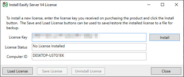 Enter the Easify Server license key you purchased into the License Key text box and click the Install button.