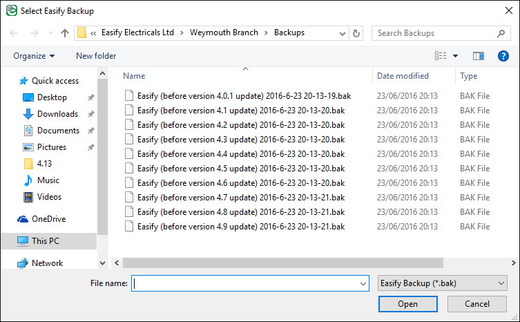 Click the Open button to begin the restore process.