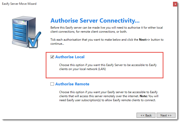 Because your Easify Server has been moved to a new computer, as a security measure you will need to re-authorise it for local and/or remote connections.