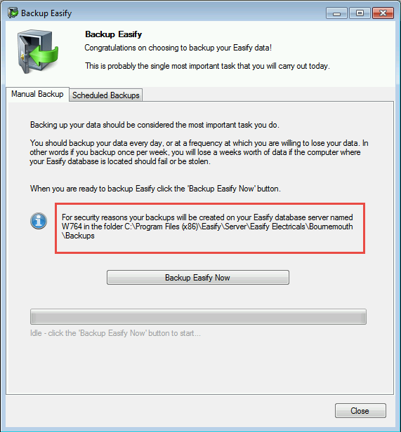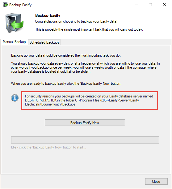 Be aware that the backup file will not be on your computer if you are accessing the Easify Server via a network, for simplicity we recommend that you carry out the backup on the original computer itself, and not on a networked client computer. The information outlined in red above contains the name of the computer on which the backup will be saved which will help you determine where the backup will be saved.