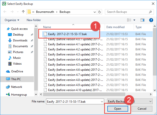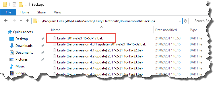 Open the folder location as outlined in red above (you can drag select the file path in the Backup Easify dialogue), and copy the backup file that you previously saved in Step 2 to this folder.