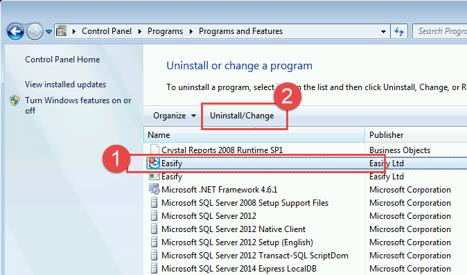 Select Easify in the list of programs to uninstall and click the Uninstall/Change button.