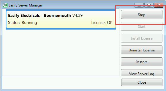 In the Easify Server Manager, select your Easify Server and click the Stop button.