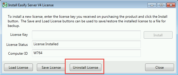 In the Install Easify Server License dialogue, click the Uninstall License button, and click OK when prompted.