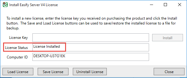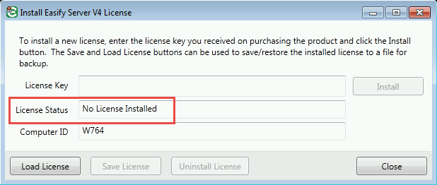After several seconds, the Easify Server License dialogue should show that the license has been uninstalled.