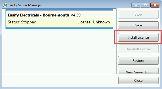 In the Easify Server Manager, select your Easify Server and click the Install License button.