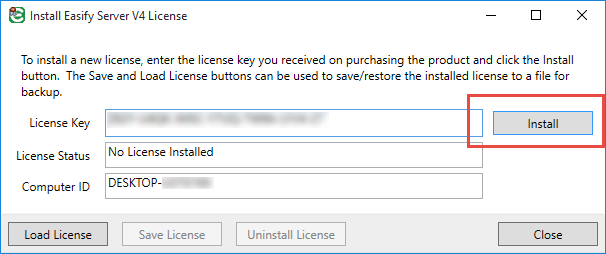 In the Install Easify Server License dialogue, enter your Easify Server product key, and click the Install License button. Click OK when prompted.