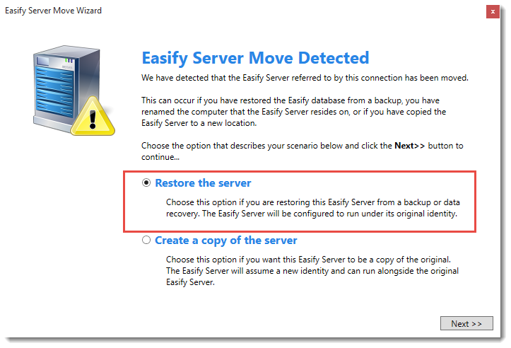 In this case we have restored the Easify Server from a backup, so select the Restore option and click Next.