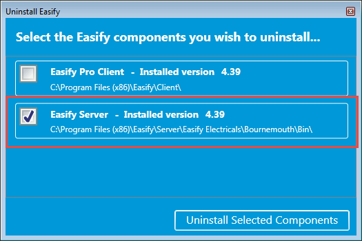 In the Uninstall Easify Dialogue, select your Easify Server, and click the Uninstall Selected Components button.