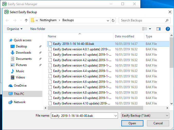 In this example, the .bak file is called Easify 2019-1-16 14-40-00.bak