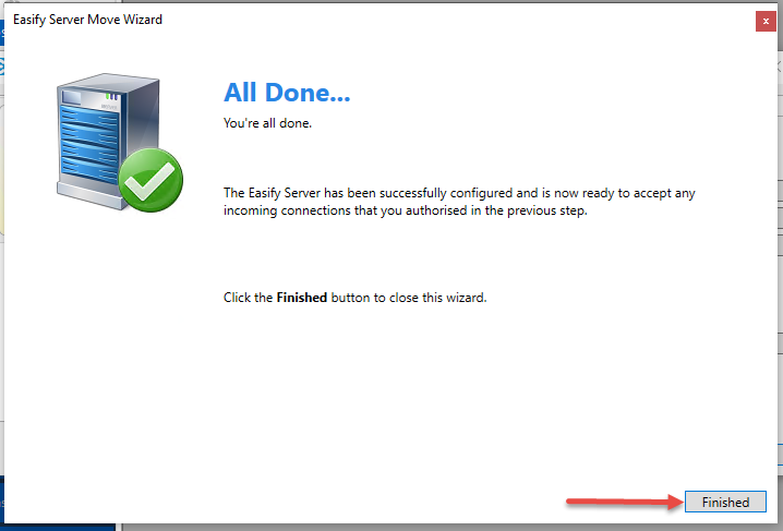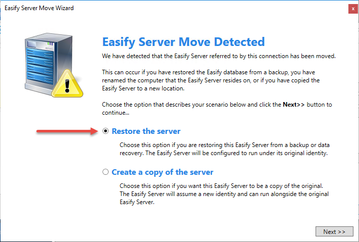 In the Easify Server Move Wizard choose "Restore Server", then click Next
