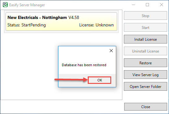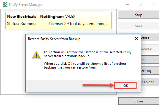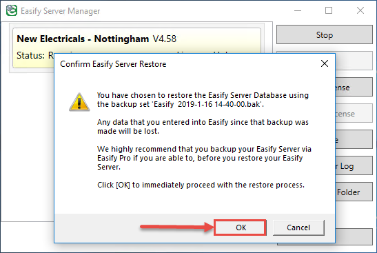 Confirm the Easify Server Restore by clicking OK on the prompt