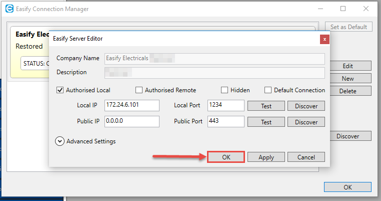 - Note that the Company Name and Company Description are no longer the ones you entered in Part I of this guide. They have been replaced by the Company Name and Description that were recorded in the .bak file. In the example below, you can see that the original Company Name record was "Easify Electricals Original" and the Description was "Original"