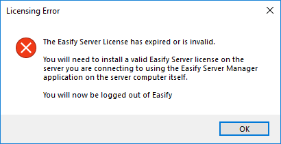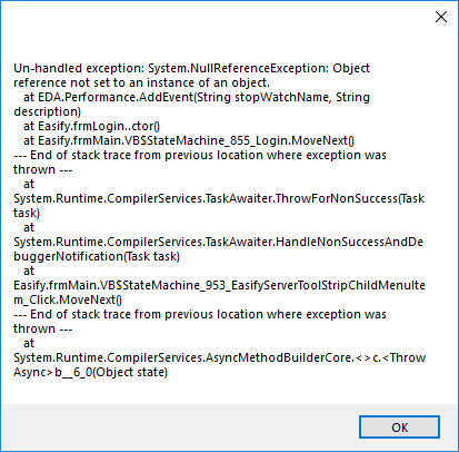 If you received the above error message when trying to login to Easify, just click OK on the message and Easify Pro will close. Re-open Easify and try logging in again.