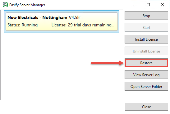 Now that you have completed the restore process, the last thing you will need to do is re-enter the license keys for Easify Server and Easify Pro. These are not automatically carried over as part of the restore process above so without re-installing the license keys, Easify will be running on a 30-day trial license. Once the trial expires you will be prompted to install a license.