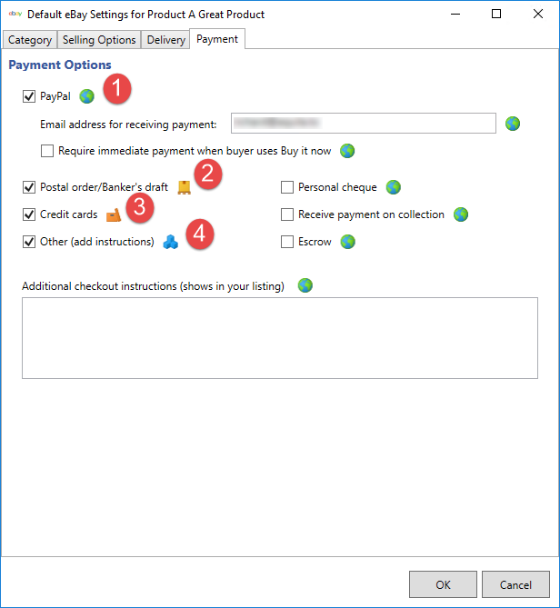 The icons tell you where the setting is inherited from. As you can see in the screenshot above, most of the settings have a globe next to them. This denotes that the setting was made in the global eBay settings, and that the value shown is from the global setting.