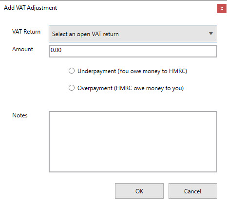 This will bring up the VAT Adjustments window. If this is the first time you have used this feature it will show blank, however as you start and record your adjustments they will show in here.
