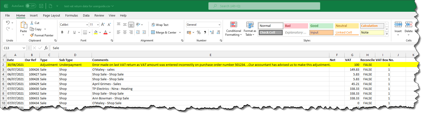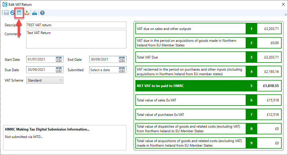 For example: This is a Test VAT return showing the amounts owed before we have recalculated to include the £100 VAT underpayment adjustment.