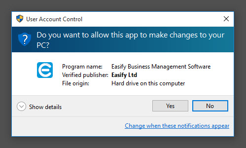 Click the Yes button to authorise Easify Setup to run.