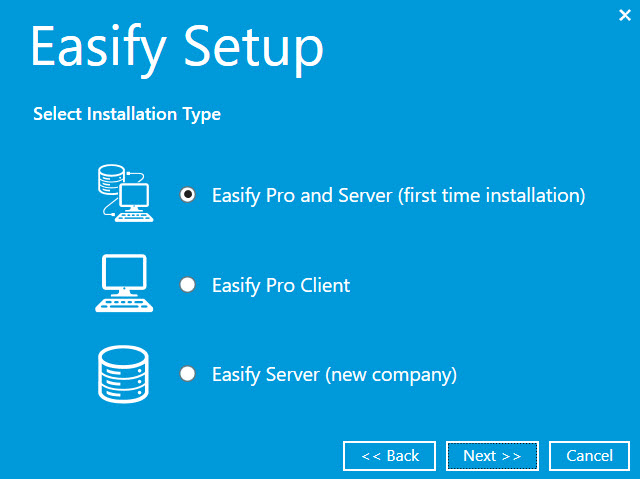 You will now be prompted to choose an installation type. Because we are performing a first time installation we want both the Easify Server and Client to be installed. So select the Easify Pro and Server (first time installation) option.