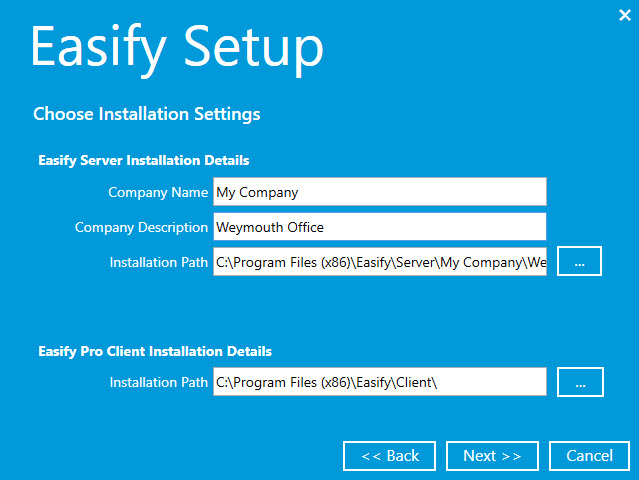 In the next page of the Easify Setup Wizard you will need to specify your Company Name and Description and optionally choose the location (installation path) where you want to install Easify.