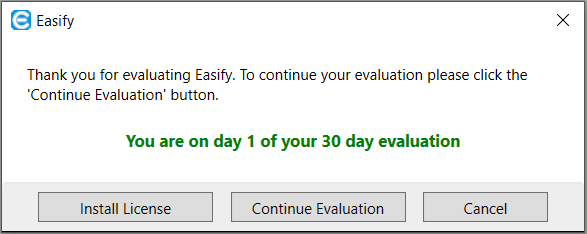 Until you enter a valid Easify license key, every time you launch Easify it will ask you if you wish to install a license or continue with your evaluation: