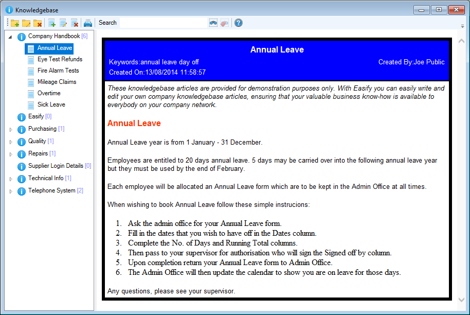 Whether you use the Knowledge Base is entirely optional and it has been included in Easify as it is a handy way to store information relating to your business.