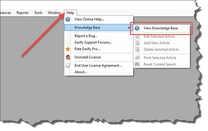 or by clicking Help->Knowledge Base->View Knowledge Base on the Easify Pro main menu: